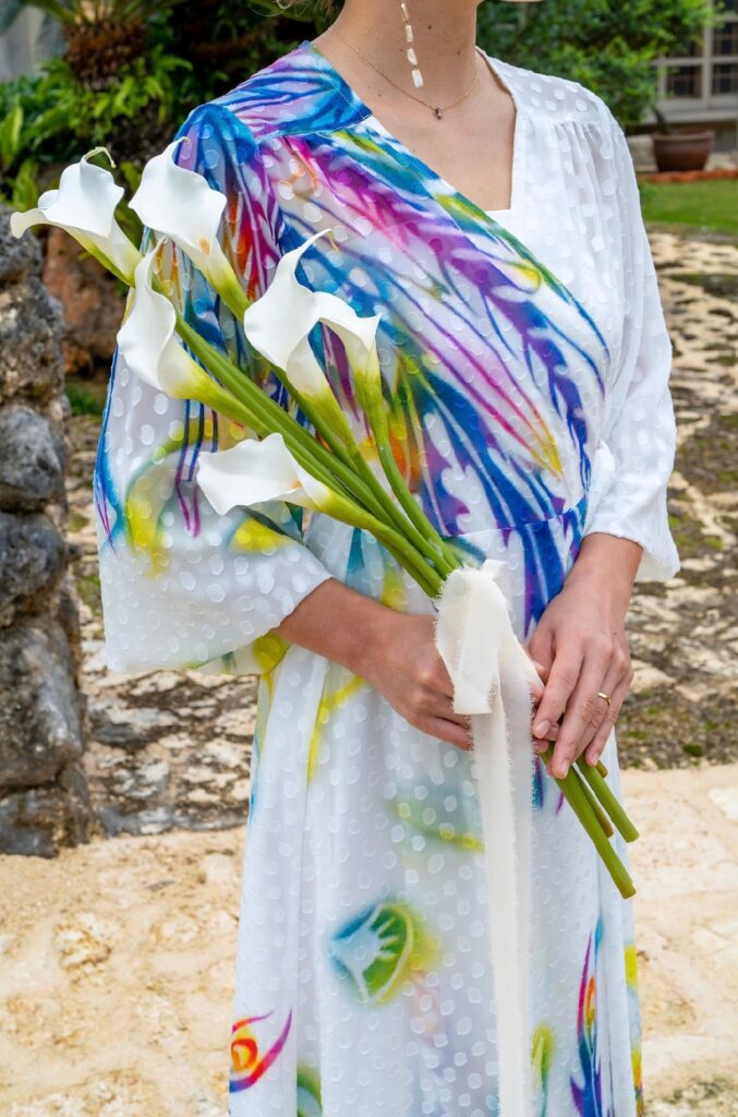 カラーだけでなく、アンスリュームやユリなどでも、一種類の花を束ねたブーケも少なくなく、ナチュラルなドレスなどによく合うブーケです。