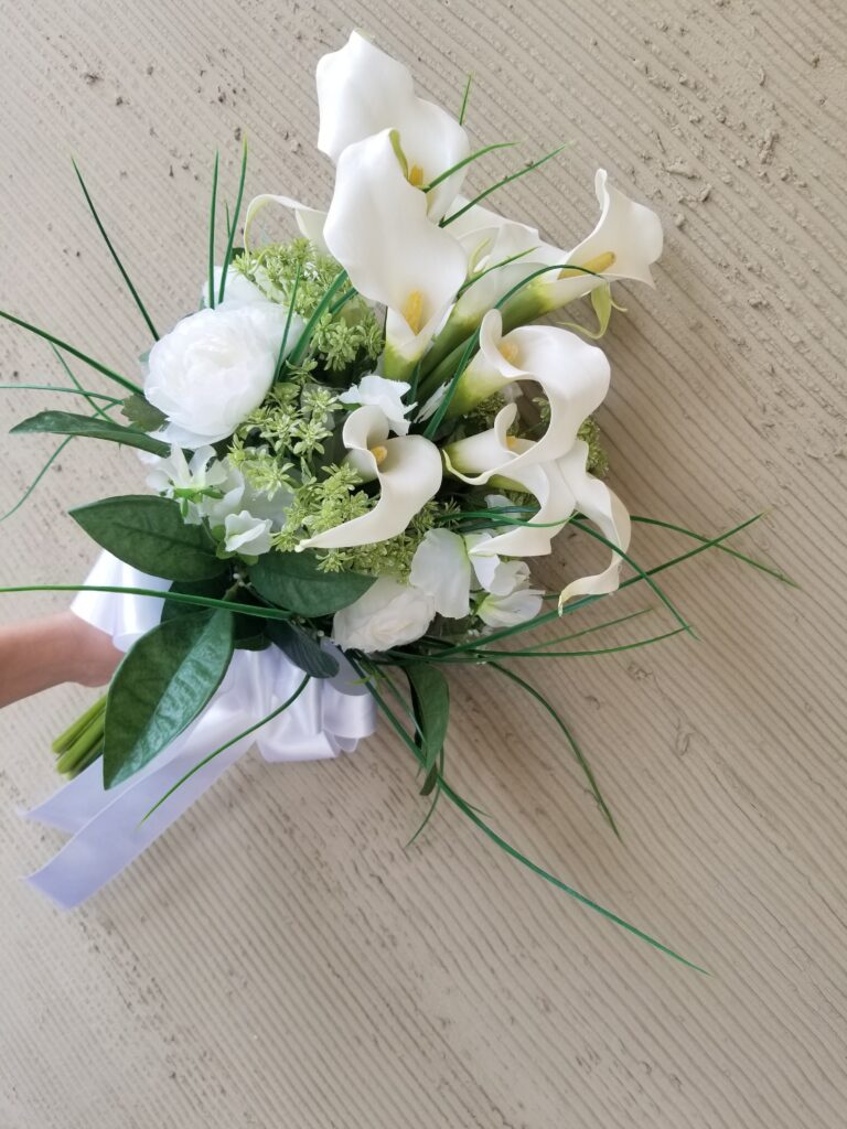 白のカラーのみを束ねたブーケは大人っぽく、おしゃれな雰囲気もあり素敵です。
