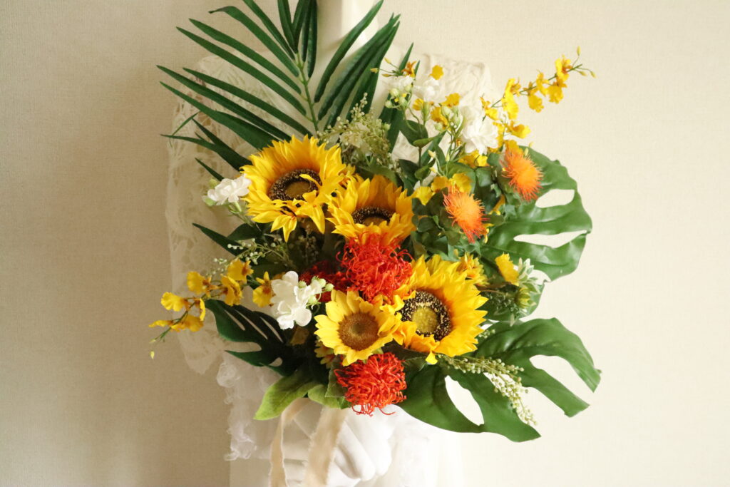 天候に左右される夏場、いろいろな意味で安心して使えるアーティフィシャルフラワーのブーケはおすすめです。