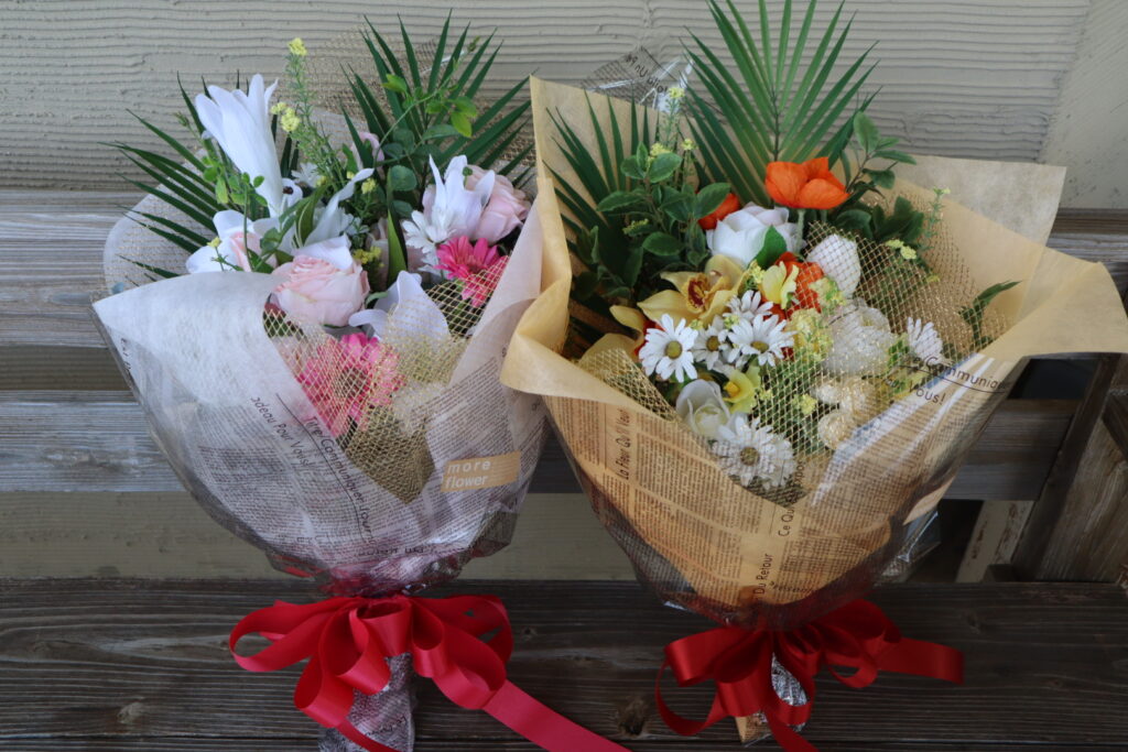 遠方からご両親が来られることも多いかとおもいますが、そのまま安心して持ち帰られて、思い出と一緒に残る花束もいいですよね。