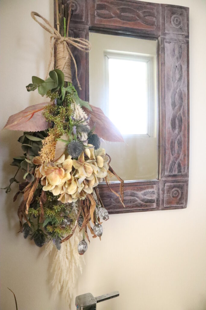 カフェなどのインテリアに、ドライフラワーのスワッグをよくみかけますが、流行っていますね。