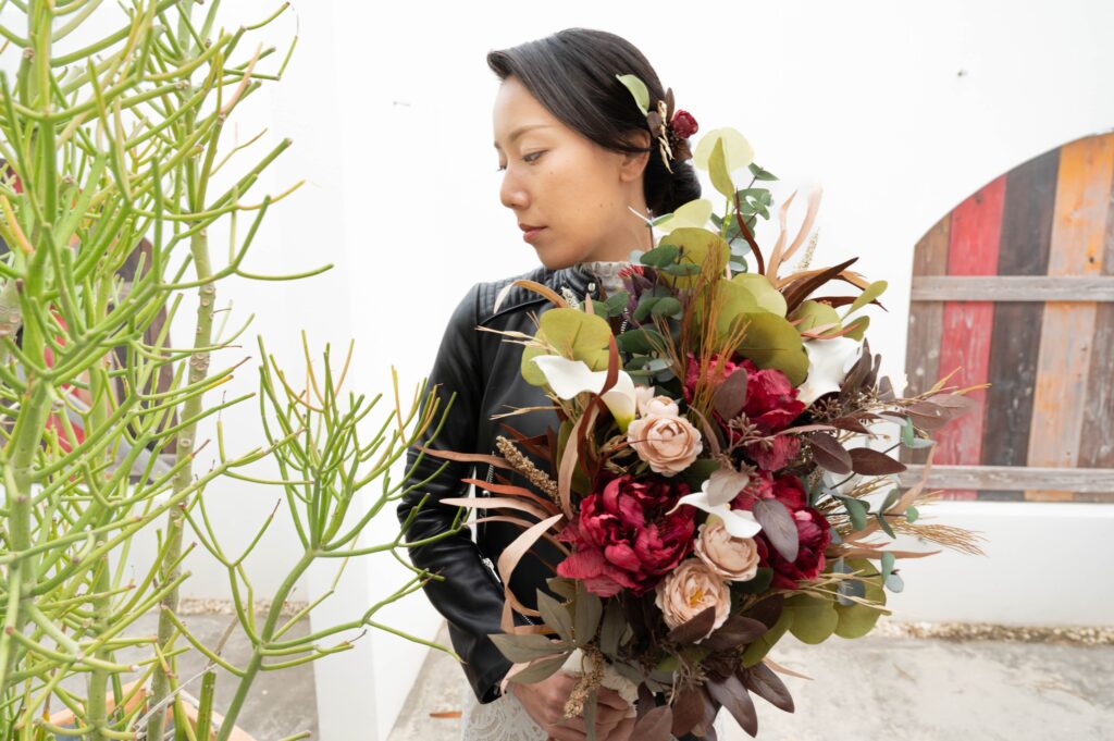 ドライフラワー風のブーケや、ススキ科イネ科などの植物、熟した実物など使って、落ち着いた雰囲気のブーケが秋らしいブーケではないでしょうか。