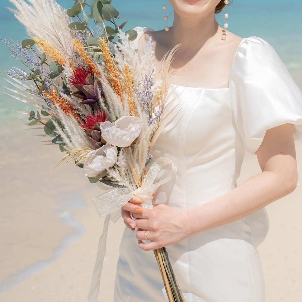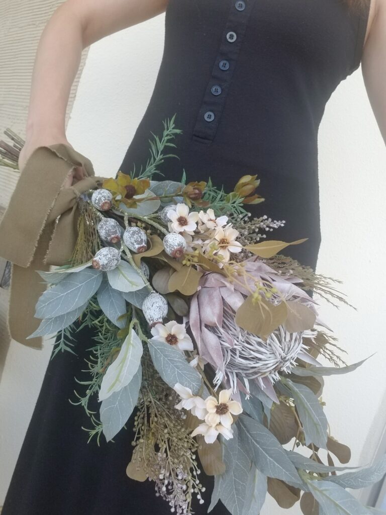 ススキ科、イネ科のように、ふわっとした素材のものでドライ風に仕上げたブーケ。