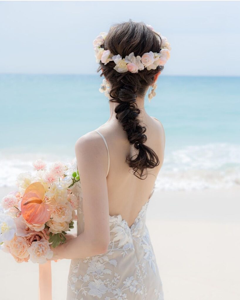 海外のウエディングのように、大きな花をボリュームいっぱいにした花冠から、ナチュラルに小花や蔦のような素材で巻きついたような花冠など、お好みです。