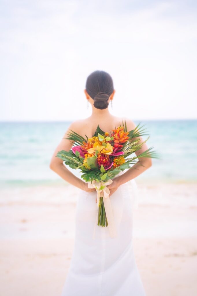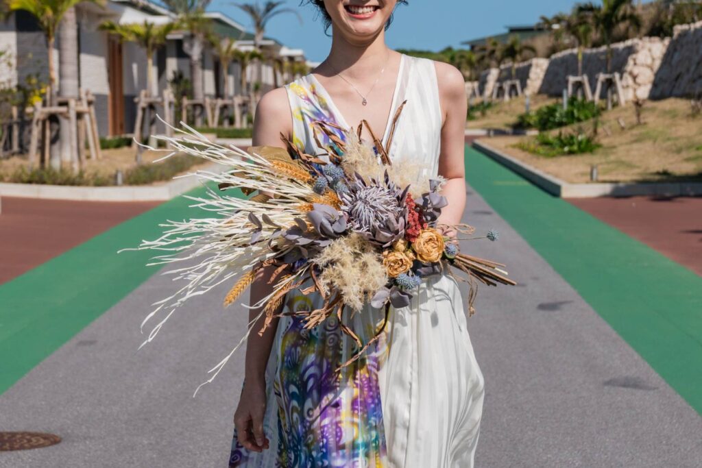 南国でのフォトウエディングに人気です。また、ビーチウエディングなど屋外のウエディングにとても映えるブーケ。