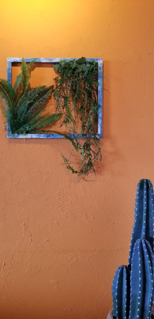 画像の壁飾りはカフェの一角です。鮮やかなオレンジの壁を生かしつつ、ナチュラルなインテリアをくわえました。