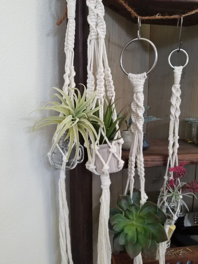 多肉植物のアーティフィシャルフラワーをポットに入れてマクラメプラントハンガーで飾るインテリアは、贈り物にも喜ばれます。(↓画像)