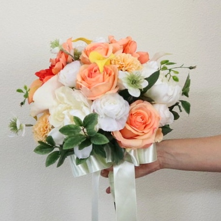 atflowerでは、花嫁さんの好みの花などで作製したアーティフィシャルフラワーのブーケを、ラッピングいたしまして配送いたします。お気軽にご相談ください。