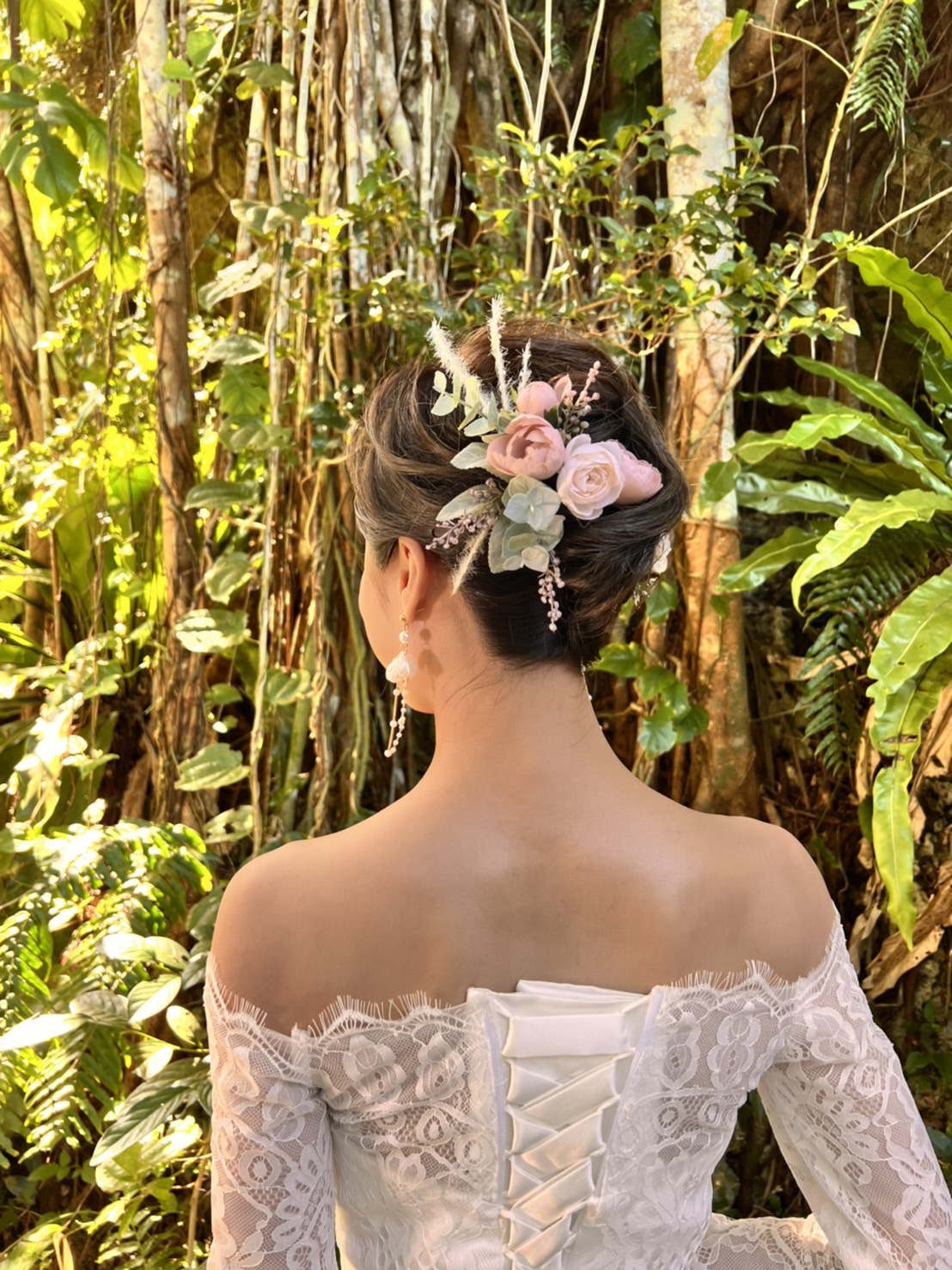南国などウエディングや、屋外のウエディング、フォトウエディングなどは髪型が崩れにくいアップスタイルも多いようです。