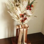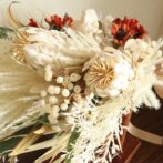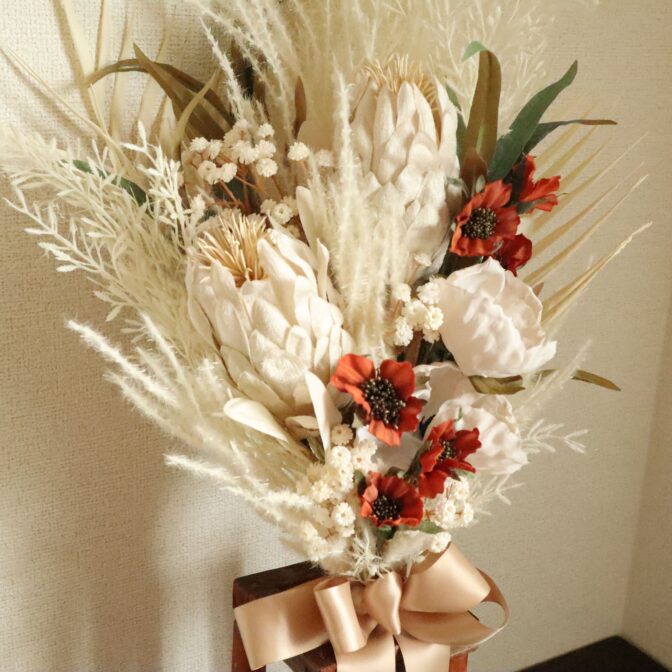 存在感たっぷりのエクリアプロテアを中心に、ホワイト系のドライフラワーでまとめた
